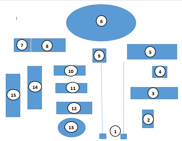 1 - Main gate 2 - Canteen 3 - Home science room 4 - Toilet 5 - Hall 1 6 - Playground 7 - Dancing room 8 - Hall 2 9 - Boo tree 10 - Office 11 - Science Lab 12 - Library 13 - Children park 14 - Hall 3 15 - Hall 4 |
